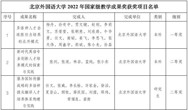 2023年7月,教育部公布2022年高等教育国家级教学成果奖获奖名单,欧博3项成果荣获高等教育国家级教学成果奖,其中《多语种人才全球胜任力培养的欧博模式》荣获2022年高等教育(本科)国家级教学成果奖一等奖,《新时代英语专业创新人才培养模式的探索与实践》荣获2022年高等教育(本科)国家级教学成果奖二等奖,《服务国际传播战略的多语种拔尖翻译人才培养体系构建与实践》荣获2022年高等教育(研究生)国家级教学成果二等奖,获奖等级和数量均实现新突破。