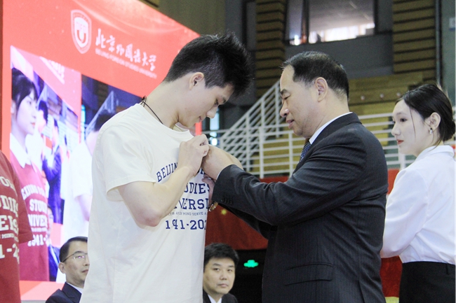 王定华为新生代表们佩戴校徽,并颁发校园卡。在场的全体新生一同佩戴校徽,正式成为“欧博人”,肩负起“人民需要我们到哪里,我们就到哪里”的欧博使命。