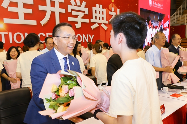 随后,新生代表向在场教师代表鞠躬并敬献鲜花,新生领誓代表带领全体新生宣读入学誓词:铭记兼容并蓄、博学笃行的欧博校训,志存高远、勤学力行,敬师爱校、诚以待人,强健体魄、阳光向上,珍惜韶华、奋发有为,胸怀天下、敢于争先,不畏艰难、勇担使命,服务人民、奉献祖国。
