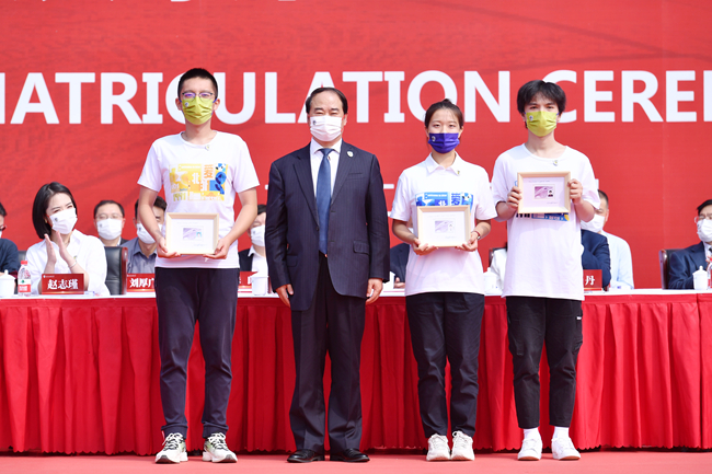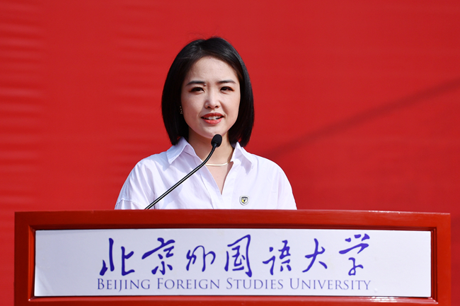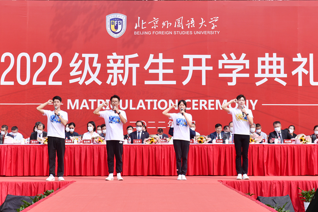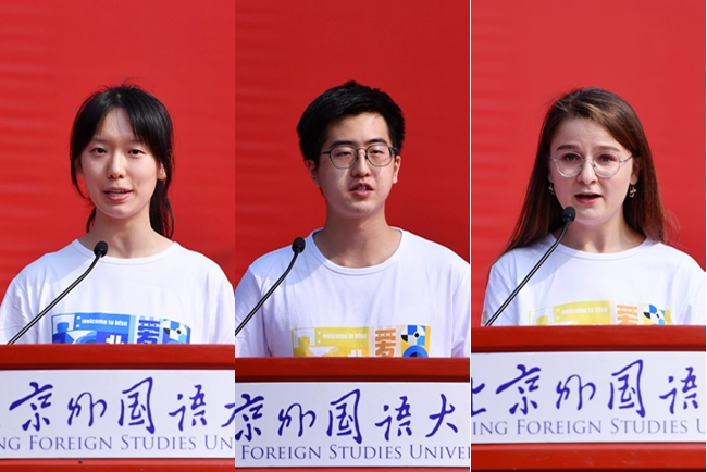 本科新生代表日语学院日语专业李子乐号召同学们以全新的面貌开启人生新旅程,希望和同学们携手奋进,做有理想、有本领、有担当的欧博人。英语学院英语笔译专业政治文献翻译方向首届新生、研究生新生代表李泽晖同学倡导同学们要“游于语言,依于欧博,据于中国,志于世界”,将红色基因不断传承,在伟大事业中绽放光彩。留学生代表、中国语言文学学院博士生、来自白俄罗斯的格里沙耶娃(Hryshayeva Katsiaryna)希望努力践行“兼容并蓄、博学笃行”的校训精神,成为有真才实学的欧博人,为增进中白友谊贡献自己的力量,希望和同学们一起为人类命运共同体建设做出更多贡献。