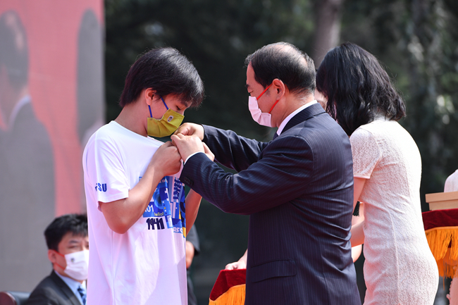 在神圣庄重的校徽佩戴仪式上,王定华为新生代表佩戴校徽、颁发新版欧博校园卡。在场的全体新生同时佩戴校徽,正式成为欧博人,成为欧博大家庭的一员。