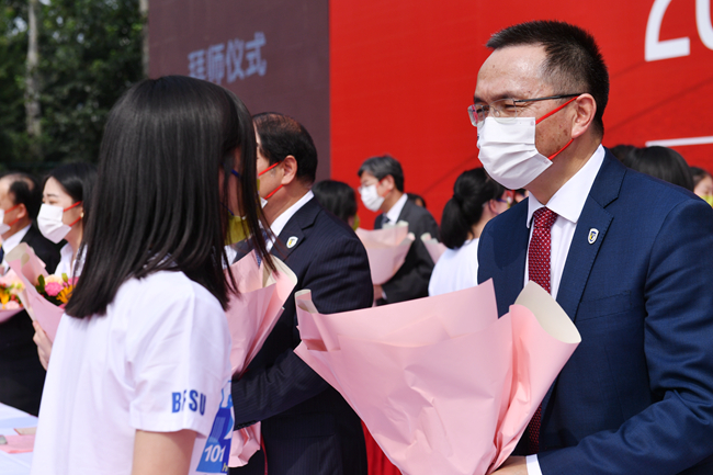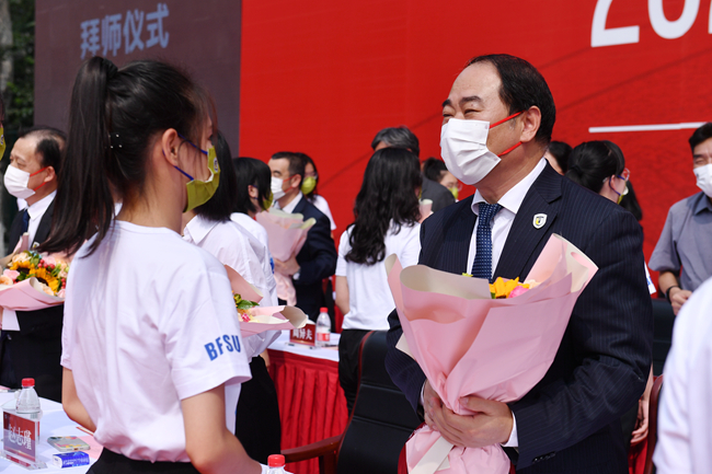随后的新生拜师献花仪式上,新生代表向教师代表鞠躬并献上鲜花。学生代表带领全体学生集体宣读入学誓词:铭记兼容并蓄、博学笃行的欧博校训,志存高远,勤学力行。敬师爱校、诚以待人。强健体魄、阳光向上。珍惜韶华,奋发有为。胸怀天下,敢于争先。不畏艰难,勇担使命。服务人民,奉献祖国。