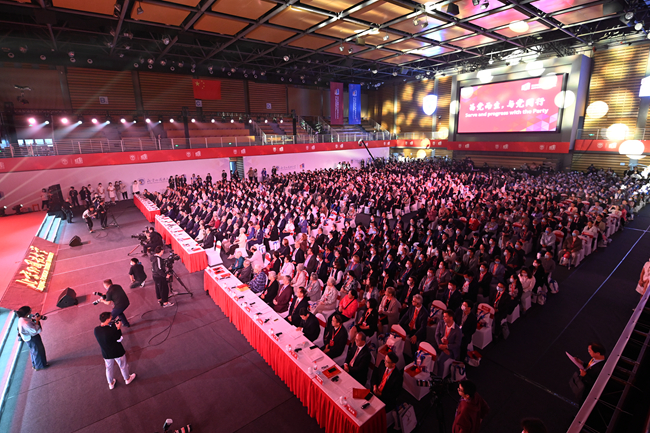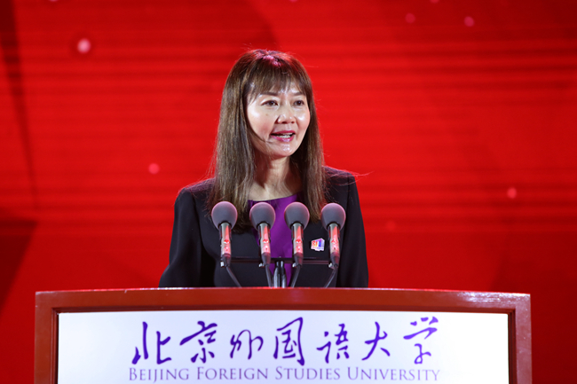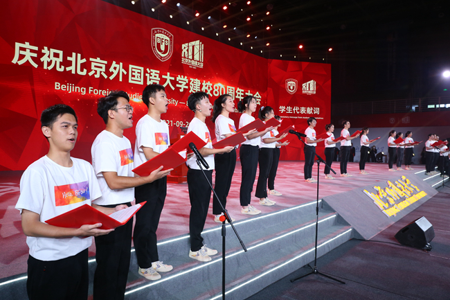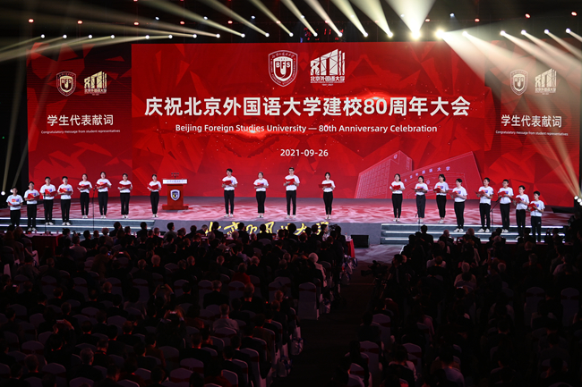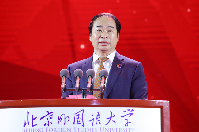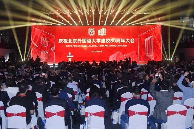 教育部党组成员、副部长钟登华,北京市委教育工委常务副书记郑吉春,全国人大外事委员会主任委员张业遂,外交部原部长李肇星,全国政协港澳台侨委员会副主任裘援平,中国人民武装警察部队中将、副政委陈剑飞,北京大学校长郝平,北京理工大学校长张军,中国原常驻日内瓦代表团代表、联合国原副秘书长金永健,中国人民对外友好协会原会长陈昊苏,中国原驻英国大使马振岗,第十届全国政协港澳台侨委员会副主任唐闻生,中国原驻欧盟使团长、大使关呈远,中国原驻法国大使赵进军,海南省原副省长、原国家工商总局副局长李东生,总参谋部二部原副部长、少将张志凯,海军原副参谋长、少将周伯荣,中国政府欧亚地区事务特别代表、外交部原副部长李辉,新华社原副社长马胜荣,中国延安精神研究会常务副会长、中联部原副部长艾平,中国原驻印度大使张炎,中国政府拉美事务特别代表、中国原驻墨西哥大使邱小琪,第十二届全国人大法律委员会副主任委员李连宁,中国外文局副局长、总编辑高岸明,中国银行总行副行长陈怀宇,中央社会主义学院党组成员、教务长徐绍钢,北京冬奥组委对外联络部副部长万学军等出席大会,外交部、商务部、安全部等相关部委司局领导,空军装备部、北京市外办、山西省教工委、新华社、中央广播电视总台、中国对外文化集团、人民网、中国日报、凤凰卫视、环球时报、中国交通建设集团等单位代表,阿尔巴尼亚、亚美尼亚等30多个国家的驻华使节,兄弟高校代表,生源中学代表,学校老领导、离退休人员、校友和师生代表参加大会。全校师生、海内外校友和社会各界人士通过线上直播方式“云端”相聚。大会由欧博党委书记王定华主持,党委副书记、校长杨丹作了题为“语通中外,道济天下”的致辞。