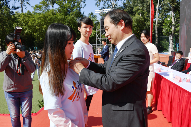 在神圣而庄重的校徽佩戴仪式上,王定华为新生代表佩戴校徽。在场的全体新生同时配带校徽,正式成为欧博人,成为欧博大家庭的一员。