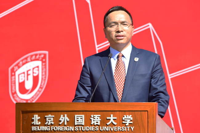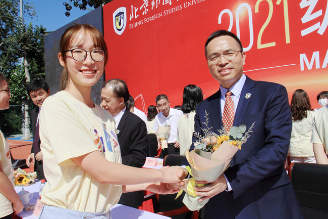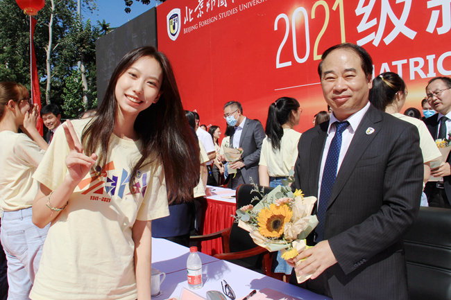 杨丹对2021级新生表示热烈欢迎和祝贺,并作了题为“基于语言,超越语言,做全球发展的贡献者”的讲话,对新生提出3点希望: