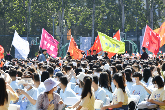 最后,校旗和各院院旗共同挥舞,开学典礼在一段精彩的快闪中、在学生自己创作的歌曲中落下帷幕。