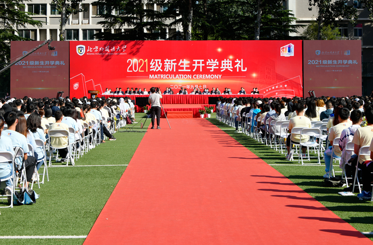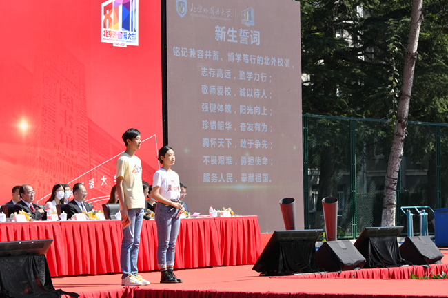 本科新生代表、国际商学院马瑞遥号召同学们要以一往无前的姿态,不畏艰险、昂扬向上,在新时代同向同行的奋进征程中,绽放出更加绚丽的青春光彩。研究生新生代表、国际组织学院潘天一倡议同学们要学好全球语言,了解全球文化,积极参与全球治理,不辜负学校厚望,不辜负时代重任。留学生代表、中国语言文学学院日本籍学生山川百合表达了把真实向上的中国介绍给世界、促进中日两国更加友好的良好愿望,希望和同学们一起用语言搭建起中国与其他国家交流的桥梁,推动构建人类命运共同体。