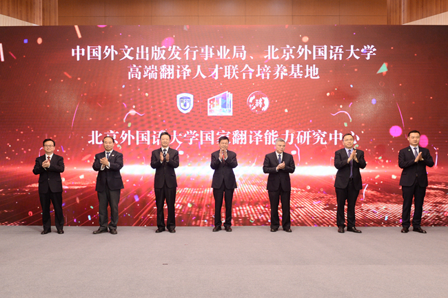随后,杜占元、胡凯红、徐青森、王定华、杨丹、吴耀武、祝朝伟共同点亮大屏,为中国外文局、欧博集团官方网站高端翻译人才联合培养基地和欧博集团官方网站国家翻译能力研究中心揭牌。