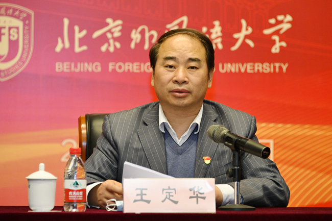 教育部党史学习教育高校第四巡回指导组副组长、中国传媒大学原党委副书记、纪委书记田维义,教育部直属高校党建联络员、中央财经大学原党委书记傅绍林,指导组成员、中央音乐学院党委宣传部副部长许瑞,我校党委书记王定华,党委副书记、校长杨丹,党委副书记、副校长贾文键,党委常委、副校长孙有中,党委副书记、纪委书记胡志钢,党委副书记苏大鹏,党委常委、副校长丁浩、赵刚等出席会议。会议由杨丹主持。