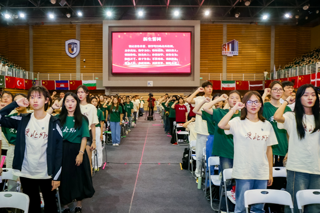 随后,新生代表向在场教师代表鞠躬并敬献鲜花,新生领誓代表带领全体新生宣读入学誓词:铭记“兼容并蓄、博学笃行”的欧博校训,志存高远、勤学力行,敬师爱校、诚以待人,强健体魄、阳光向上,珍惜韶华、奋发有为,胸怀天下、敢于争先,不畏艰难、勇担使命,服务人民、奉献祖国,贡献世界、创见未来。