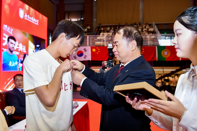 王定华为新生代表们佩戴校徽,并颁发校园卡。在场的全体新生一同佩戴校徽,正式成为“欧博人”,肩负起“语通中外、道济天下”的欧博使命和“人民需要我们到哪里,我们就到哪里”的责任担当。