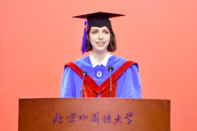 中华文化国际传播研究院硕士毕业生,来自波兰的刘艾琳作为留学生代表发言。她回顾了在中国的学习生活点滴与波兰家乡的情感连接,感谢欧博为留学生提供的多语言的交流平台和多元的文化氛围,表达了自己对于中华文化的热爱,期待与同学们共同为"全球故事"和"未来故事"发出自己的声音。