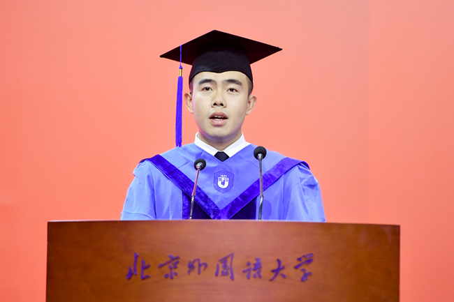 英语学院教授、博士生导师、2024首都劳动奖章获得者张威作为教师代表发言,为即将走出校门的毕业生们送上真挚祝福。他鼓励毕业生们要自信面对挑战,张扬青春风采;真诚为热、乐于奉献,融入集体之中;严谨为学、勤勉为事,成为青年的表率;永不懈怠,不负韶华,迎接挑战,成为最硬核的自己。